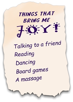 Think about the last time you did something truly joyful or mellow? When you are suddenly faced with free time are you able to engage in an activity that truly mellows you out or energizes you? Wouldn't it be wonderful to make a "Joy List" identifying the perfect things you would like to do, so when you do have leisure time something on your "Joy List" will look appealing!
