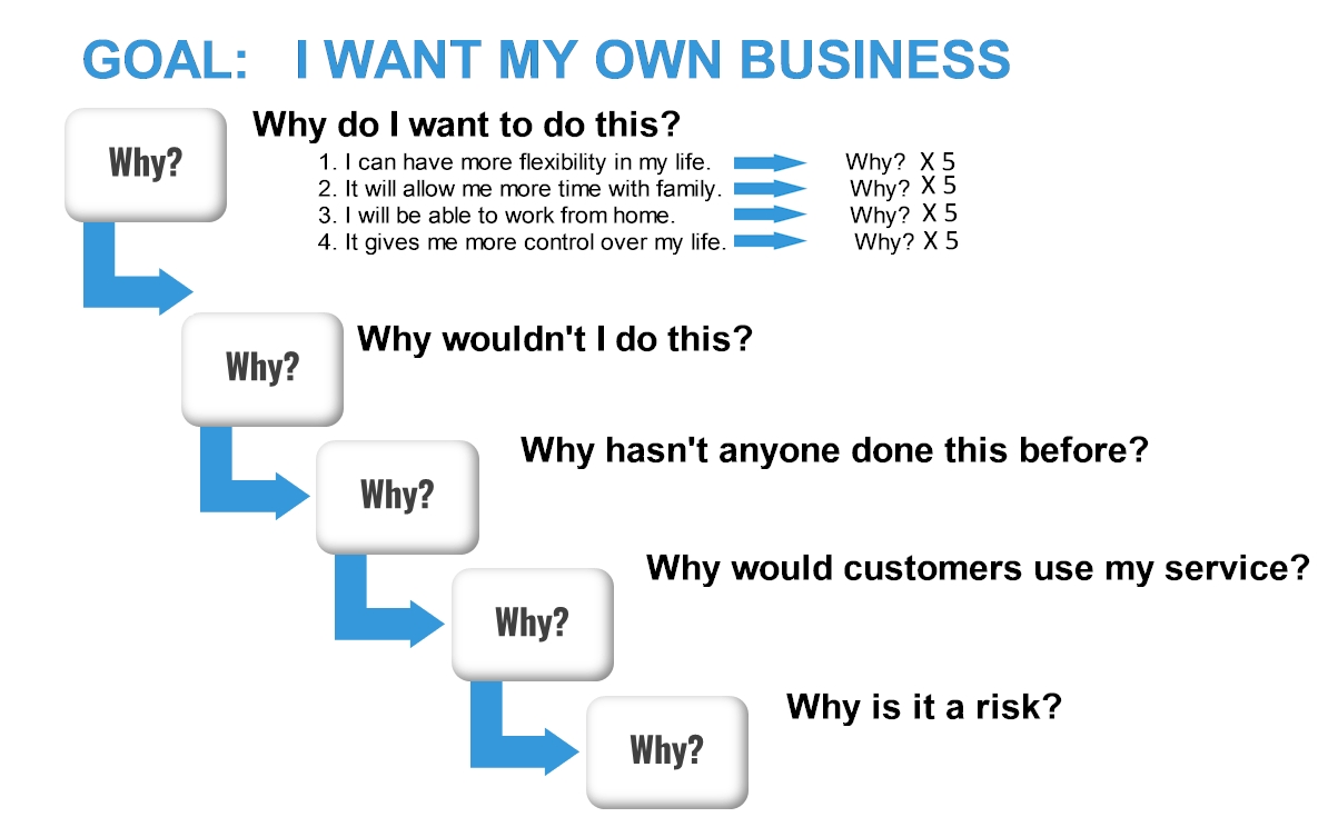 This technique addresses the challenge by asking the five why’s: Of course, the “five why’s” should be connected to their initial question and you should be smart about determine the five why questions. Or ask someone you trust to ask the initial questions. Answer the questions and then ask “five why’s” of each answer. Be spontaneous. Do this process at least five times. You end up with a long collection of answers that you can scrutinize.