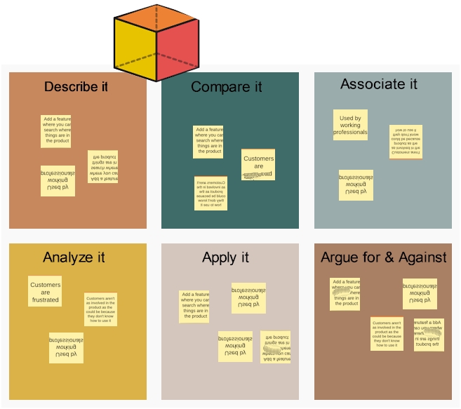 A cube has six sides. Basically with this method you arrive at a variety of answers to six specific questions. You could use six pieces of paper or divide a page into six sections.