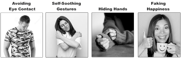B. Self-soothing gestures: Our anxiety manifests itself in how we touch our face or rub the skin of our arms and hands. Both can be soothing behaviors when we feel ill at ease. We all engage in “self-soothing” gestures that are evocative of when we were babies and needed mom or dad to gently rub our backs or massage our little fingers to calm us. They send signals of low or-esteem, doubt or deceit.