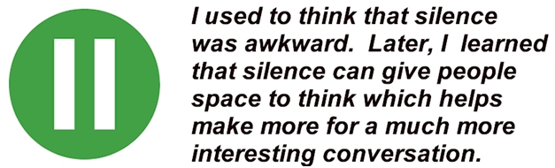 Usually silence makes people uncomfortable and they jump in to fill the quiet with words, often-extraneous words. You can nod encouragement or offer a gesture of understanding, but you should not interrupt unless invited to do so. If you are tempted to speak, you should be mindful of respecting the other person. Tell yourself, “I need to care about hearing and understanding what she has to say more than I care about her hearing me.”